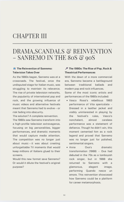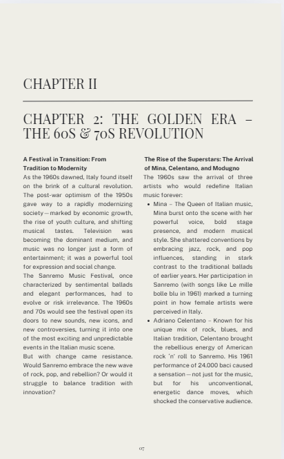 A curated selection of excerpts from the 7 chapters that explore the history, drama, and cultural impact of Sanremo.